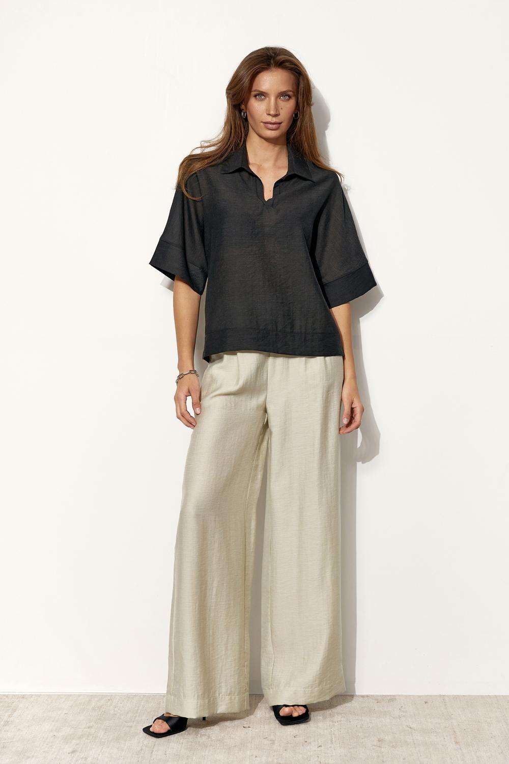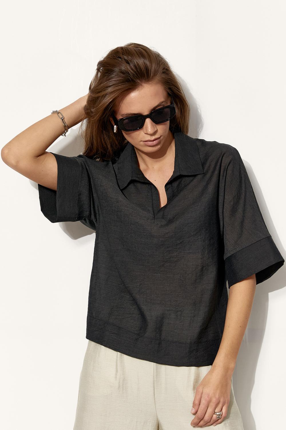 Straight, loose silhouette with wide sleeve cuffs and a clean hem. The open polo neckline adds sophistication and makes it easy to style for both casual and chic outfits.